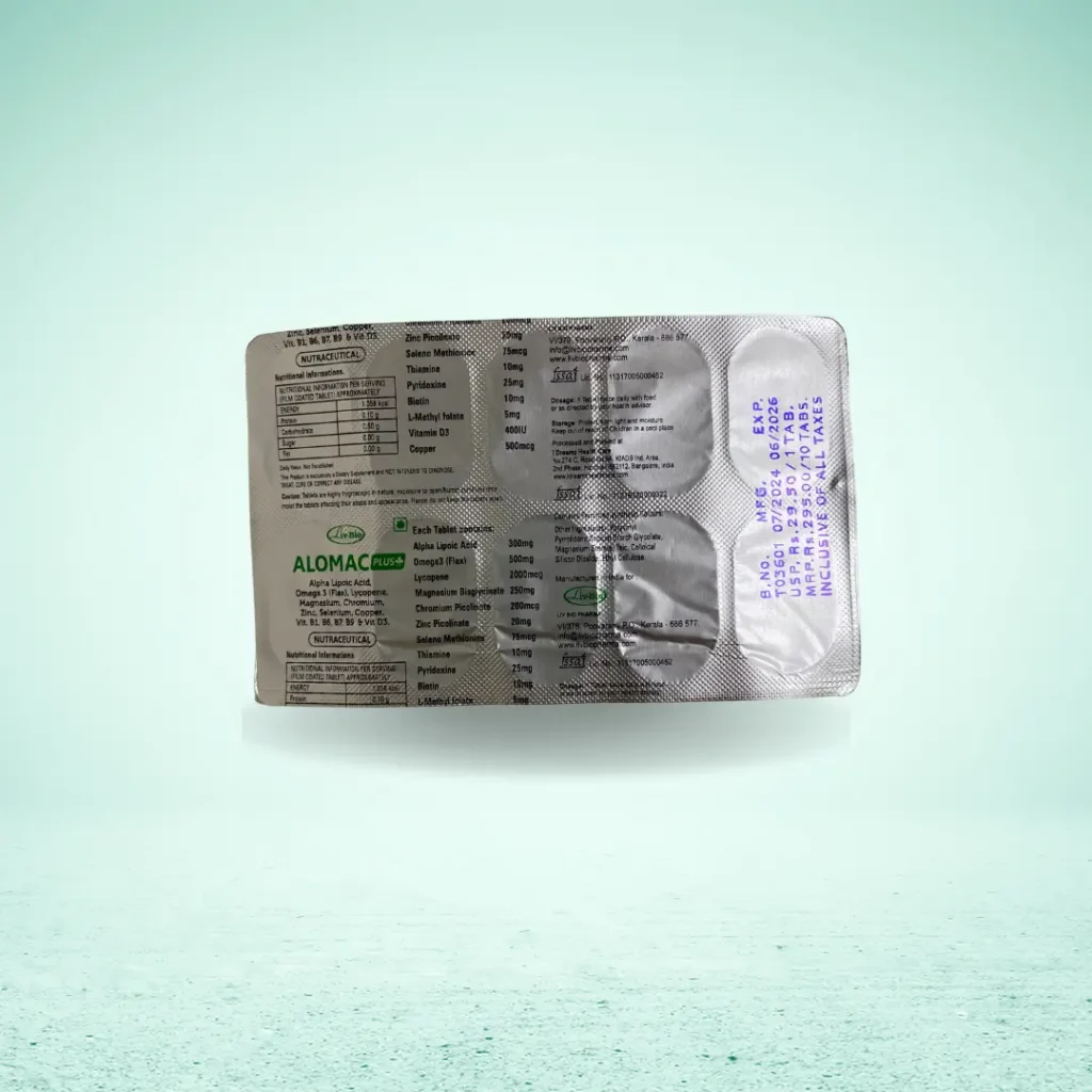 Alomac Plus is meant to offer a strong mix of minerals, vitamins, vital fatty acids, and antioxidants. It is especially meant to enhance best health by lowering oxidative stress and encouraging a balanced consumption of essential nutrients. Together, the tablet’s omega-3 fatty acids, alpha-lipoic acid, and assortment of minerals and vitamins improve well-being.