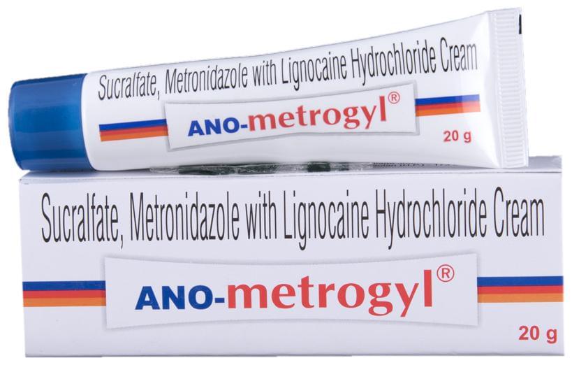 Ano Metrogyl Cream contains Lidocaine, Metronidazole, and Sucralfate. Lidocaine provides rapid pain relief by numbing the affected area. Metronidazole is an antibiotic that prevents infection, while Sucralfate acts as a protective barrier to help heal damaged tissue. This combination makes it effective for managing symptoms like burning, itching, and discomfort associated with anal fissures and hemorrhoids. Suitable for short-term use under medical supervision.