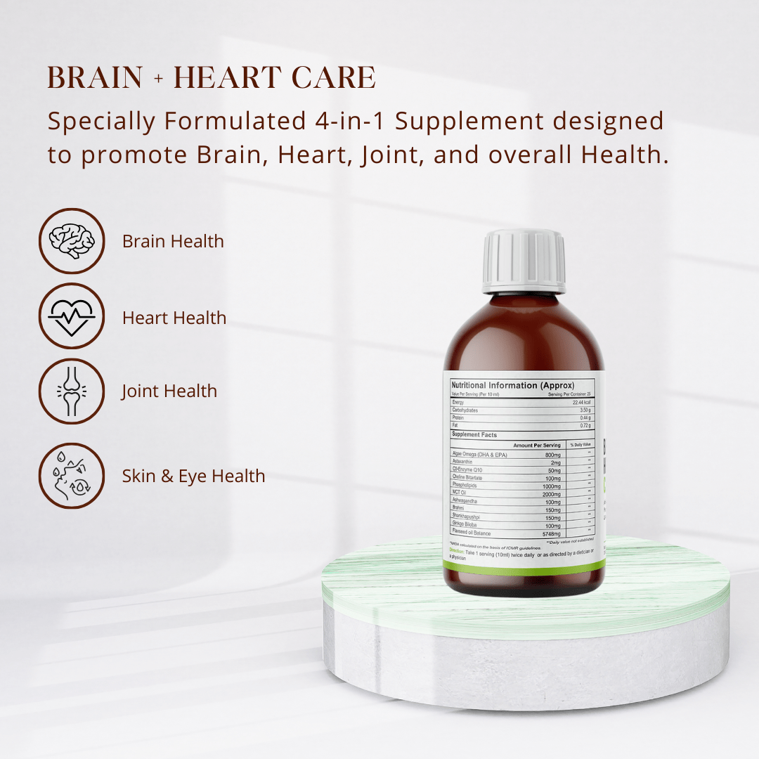 Arka Brain + Heart Care is a cutting-edge supplement that combines the power of phospholipids, Omega-3 fatty acids, and potent antioxidants to support overall health. It is specially crafted to enhance cognitive function, improve heart health, and support joint mobility and skin health.