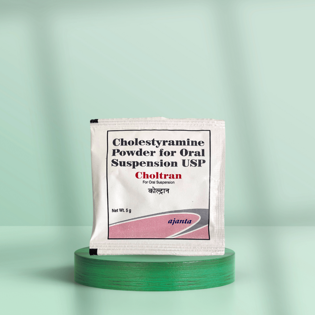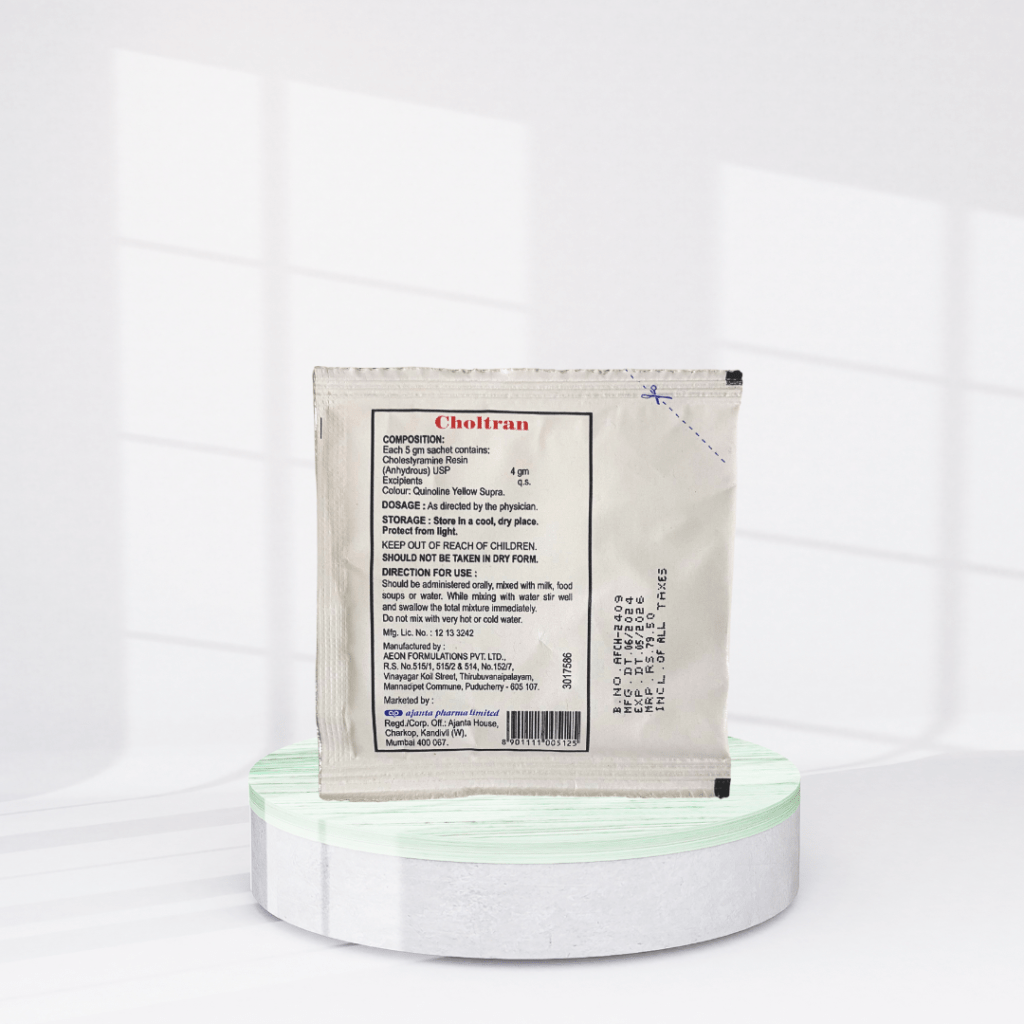 • Choltran Sachet acts by binding to cholesterol in the gastrointestinal tract and preventing its absorption. This lowers the cholesterol levels in the blood and reduces the risk associated with high cholesterol.