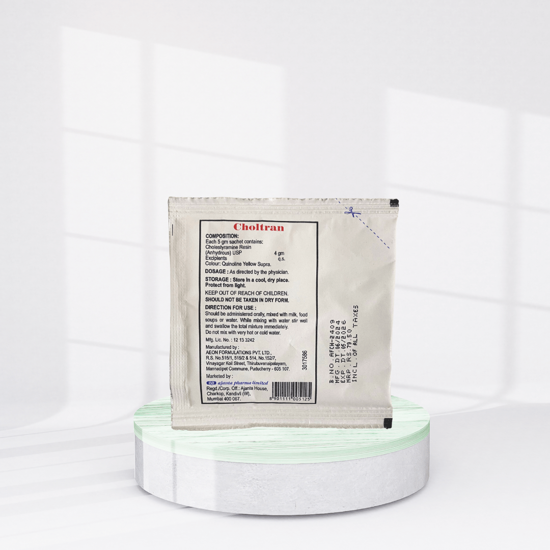 Designed to lower high cholesterol, Choltran Sachet 5gm is a specialist formulation that can cause narrowed blood arteries and higher risk of heart attack or stroke. By preventing the absorption of cholesterol in the intestines, this oral solution lowers general cholesterol levels in the blood. It also helps with diarrhea and itching connected with some liver illnesses. Taken either alone or in combination with other drugs, choltran provides versatility in dietary and temporal preferences to fit perfectly into your everyday schedule.