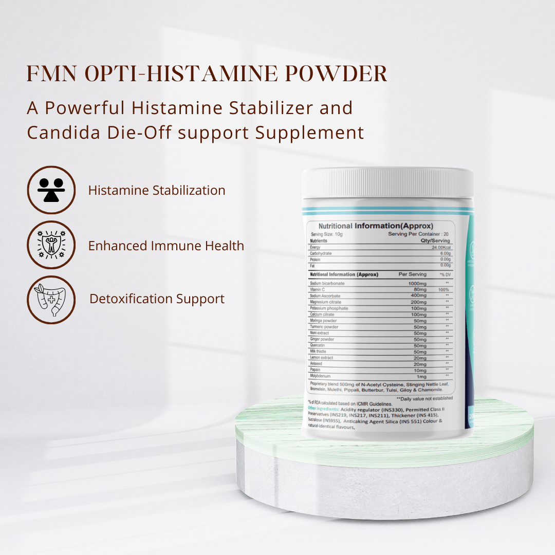Candida Die-Off Support: FMN Opti-Histamine contains ingredients that support candida die-off reactions, helping the body eliminate toxins and metabolic waste products associated with fungal overgrowth. By promoting detoxification processes, this supplement supports immune system function and overall wellness.