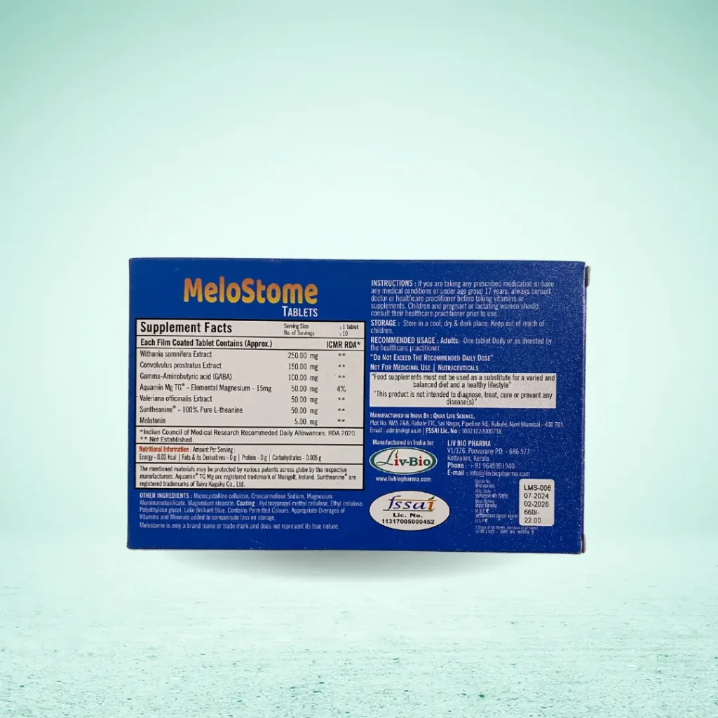 MELOSTOME pills include a special combination of natural components meant to induce peaceful sleep and properly control stress. Melatonin, Suntheanine, GABA, and essential herbal extracts including Ashwagandha, Shankpushpi, and Valerian Root are mixed in this recipe to help you fall asleep faster, remain asleep longer, and wake up feeling rejuvenated. Gentle, non-habit forming MELOSTOME guarantees that your nightly focus on safe, healthy sleep, so enabling you to preserve your natural sleep cycle free from depending on pharmaceutical sleep aids.