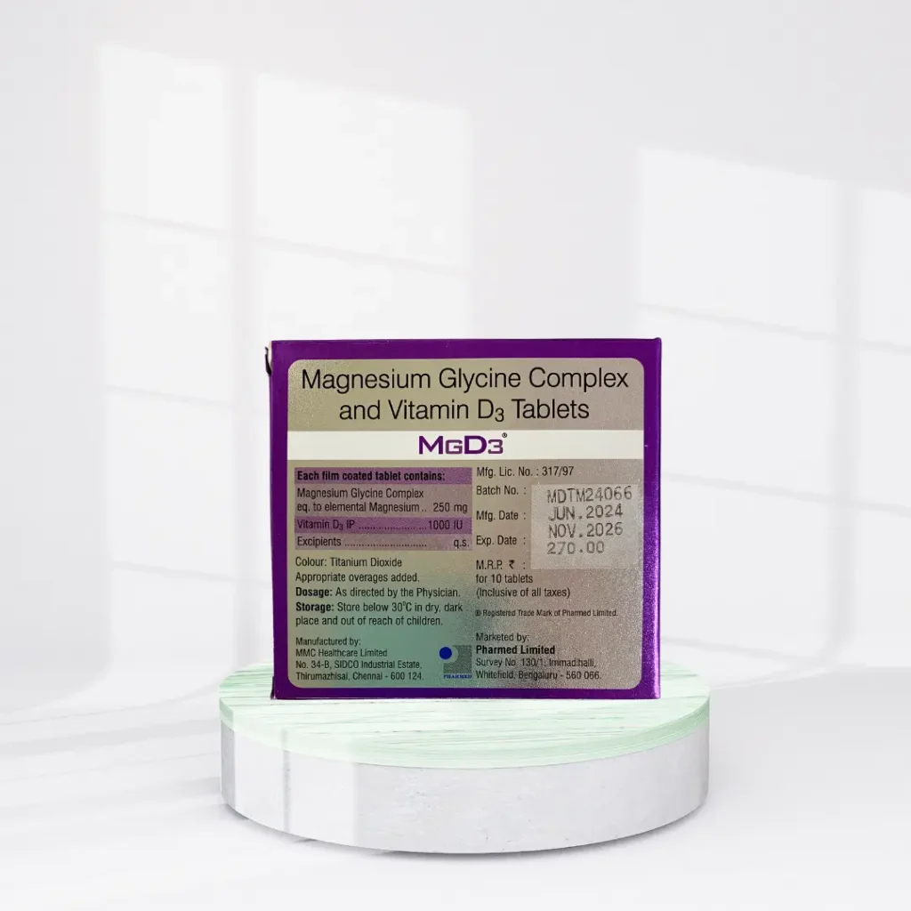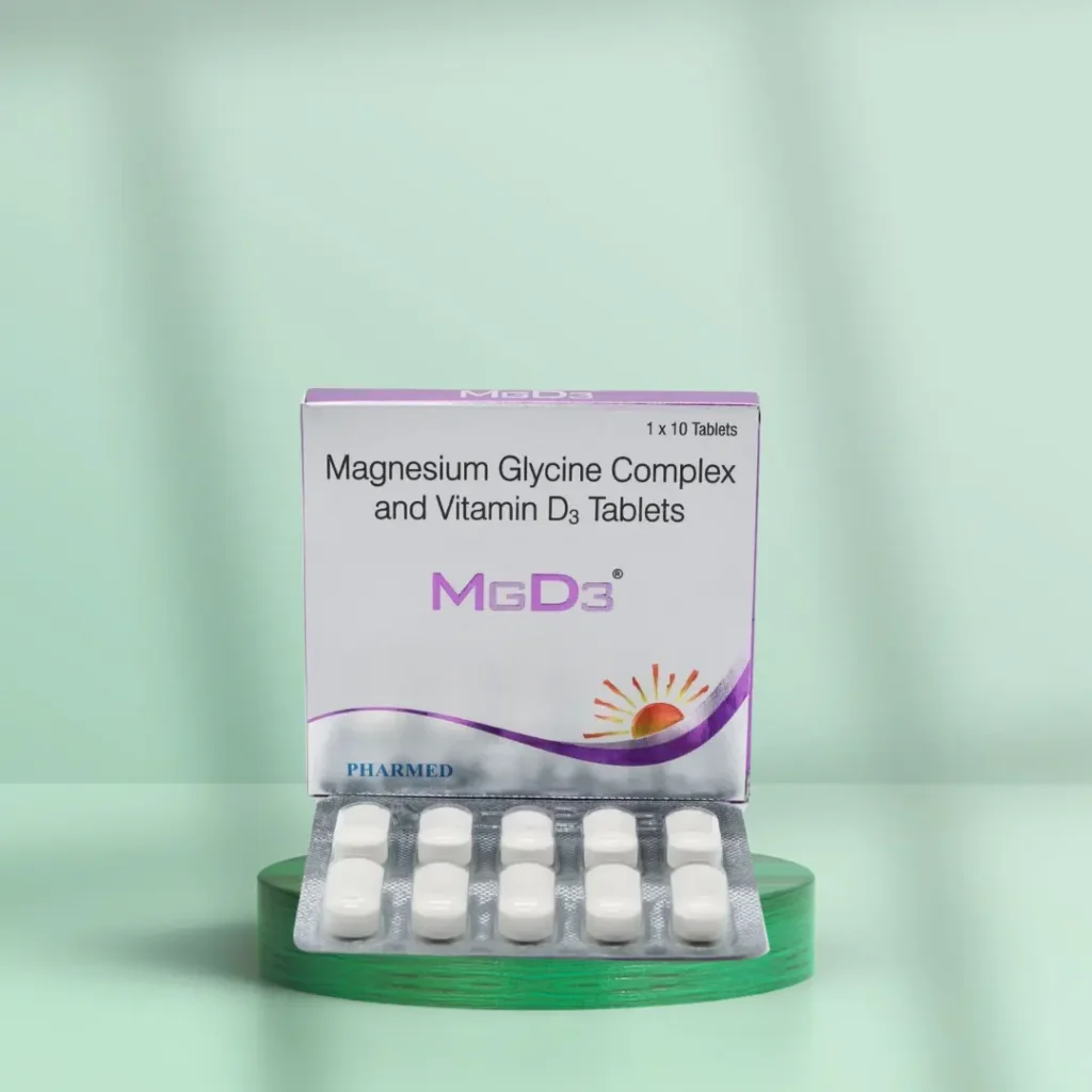 Advanced dietary supplement Mgd3 Tablet improves cardiovascular, muscle, and bone health as well as other aspects. Essential minerals Magnesium Glycine and Vitamin D3 combine powerfully to improve the body’s calcium absorption capacity, therefore supporting strong bones and teeth. This formulation is a must addition to your daily health program since it not only promotes the appropriate operation of muscles and nerves but also helps preserve good bone density.