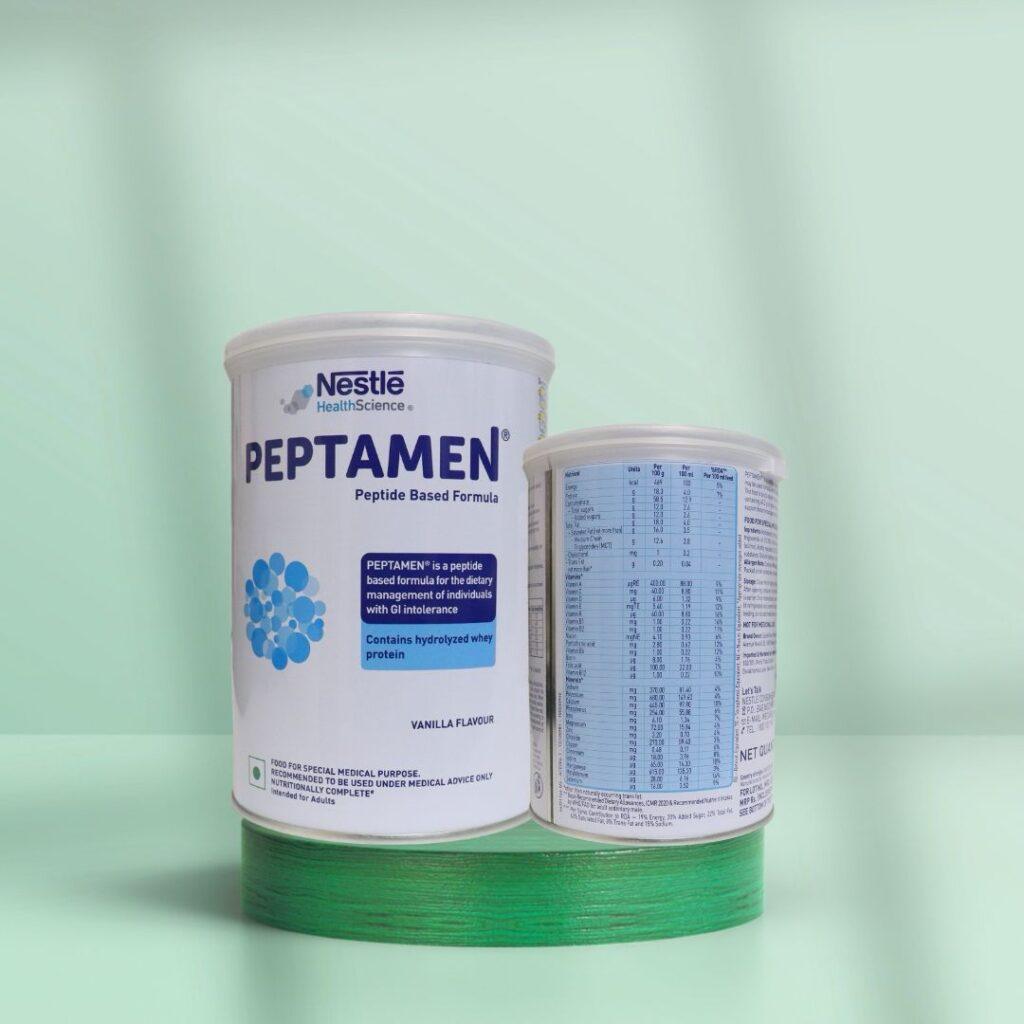 Peptamen Peptide-Based Diet Powder Vanilla contains 40.3 gm of hydrolyzed whey protein per liter and is rich in MCT (Medium Chain Triglycerides). It is designed to improve tolerance in individuals with impaired gastrointestinal (GI) functions by providing targeted nutritional support. The nitrogen from whey peptides is well tolerated, absorbed, and utilized by the body. This formula can be used for total enteral support through tube feeding or oral administration.