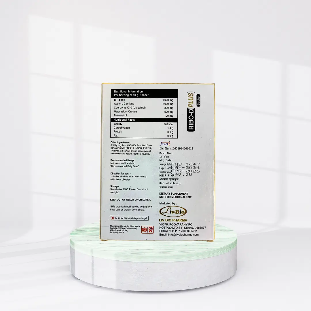 Using ribose, a basic sugar the body generates naturally and necessary for the production of DNA, RNA, and critical energy molecules like ATP, RIBO D PLUS by LIV Bio PHARMA maximizes this power. Those wishing to support their cellular energy levels, enhance heart health, and assist in recuperation following vigorous physical exercise may find perfect fit for this product. Every sachet of RIBO D PLUS provides a calculated ribose dosage to maximize body processes and preserve vital biochemical pathways linked in preserving health.