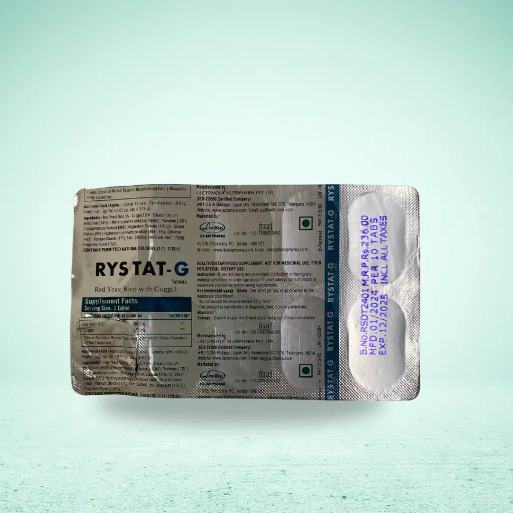RYSTAT-G combines the traditional wisdom of Red Yeast Rice with the potent properties of Guggul to create a powerful supplement that supports cardiovascular health. Each tablet is carefully formulated to maintain healthy cholesterol levels and improve lipid profiles. Red Yeast Rice, known for its natural Monacolin K, helps reduce low-density lipoprotein (LDL or “bad” cholesterol) and triglycerides. Guggul, a resin extracted from the Commiphora mukul tree, complements by boosting heart health and enhancing lipid metabolism. Together, these ingredients work synergistically to promote a healthier cardiovascular system.