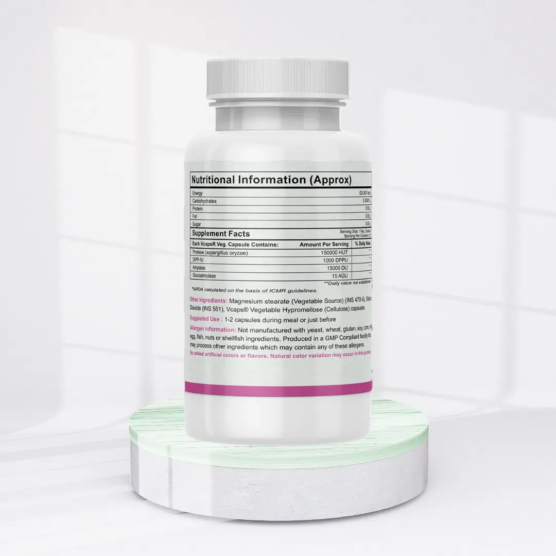 • Enhanced Nutrient Absorption: Improves the body’s ability to absorb essential vitamins and minerals from gluten-containing foods by promoting thorough carbohydrate and starch digestion.